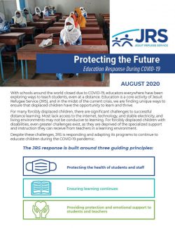 Education is a core activity of JRS, and in the midst of the current crisis we are finding unique ways to ensure that displaced children have the opportunity to learn and thrive. Read about our approach and lessons we’ve learned in adapting our programs during the pandemic in our paper, Protecting the Future: Education Response During COVID-19.