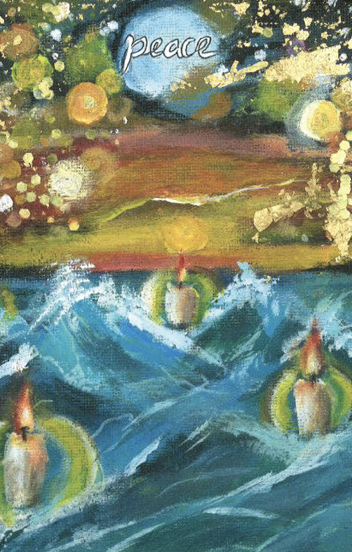 Fowza, a member of the Jesuit Refugee Service (JRS) community for nearly 12 years, is the artist behind JRS/USA’s 2024 Christmas card. Her painting depicts candles drifting on a stormy sea, their flickering light reaching toward a bright moon.
