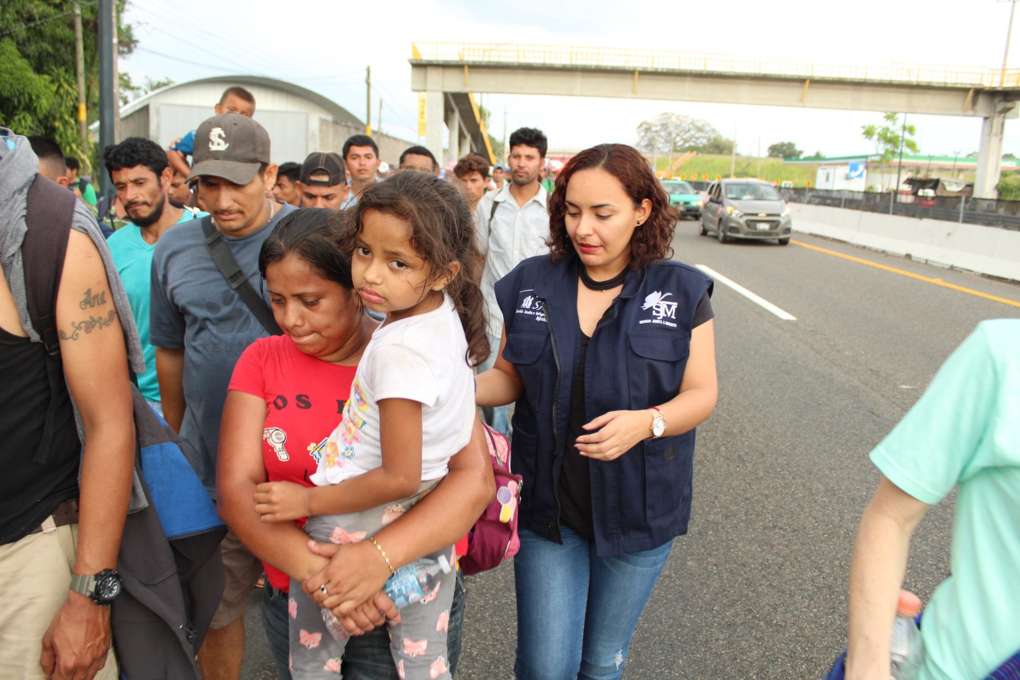 Migrants walking with a woman leading the way while holding a young girl. There is a woman wearing a JRS vest walking to the right of them.