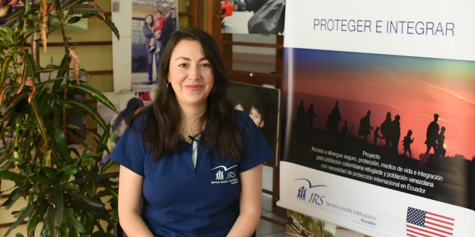 A group of people standing in front of the JRS Ecuador building with their backs turned towards the camera.